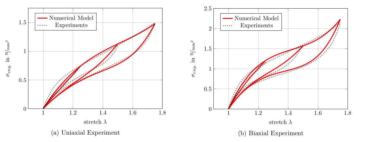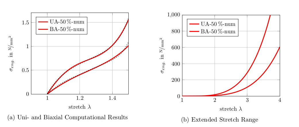 Our equipment allows for the determination of experimental data vital for elastomers like uniaxial and equibiaxial tests as well as pure shear tests. For the determination of viscoelastic material parameters creep- and relaxation tests are possible, both in uni- and equibiaxial setting. Despite these specific tests, quasistatic tests can be performed on metal to rubber parts in order to capture stiffness – or relaxation behavior. Some examples of material characterizations are shown in the images.